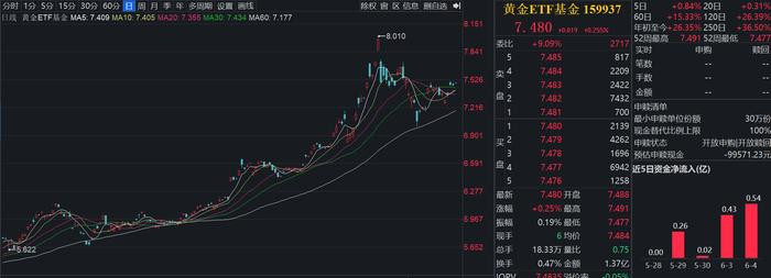国际黄金市场正上演多空势力的精彩对决。周四(6月5日)现货黄金价格在3374美元/盎司附近展开拉锯战。现交投于3370美元/盎司配资排名,跌幅-0.04%。黄金ETF基金(159937)上涨0.26%,换手率0.47%,成交金额1.37亿元。